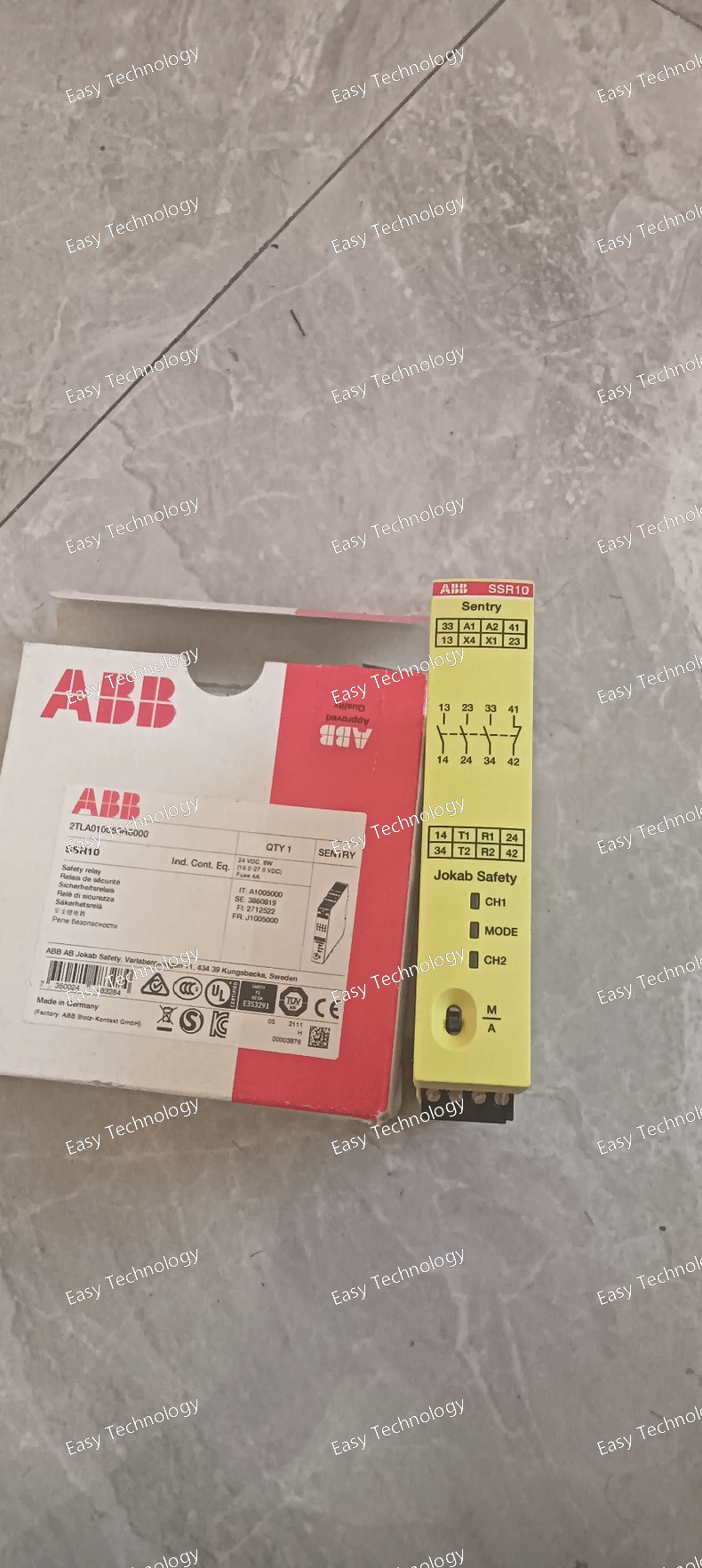 The ABB SSR10 (2TLA010050R0000) is a compact safety relay used to monitor safety devices such as emergency‑stop buttons, safety switches/interlocks, or OSSD‑output devices (e.g., safety light curtains) in single‑channel or dual‑channel configurations. When safe conditions are detected, it provides safety‑rated relay outputs. The relay supports manual‑reset or automatic‑reset operation, is DIN‑rail mountable, and features screw‑terminal wiring and LED indicators for supply, input, and output status. It is suitable for emergency‑stop circuits, guard interlocks, light‑curtain monitoring, and other machine‑safety applications.