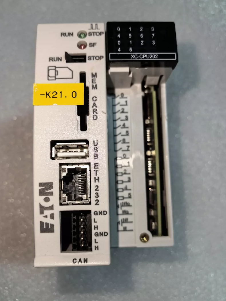 The Eaton XC-CPU202-EC4M-8DI-6DO-XV is a compact modular PLC designed for industrial automation, combining CPU, I/O, and communication in one unit. It features 8 digital inputs, 6 digital outputs, and Ethernet communication for seamless integration into control systems.
