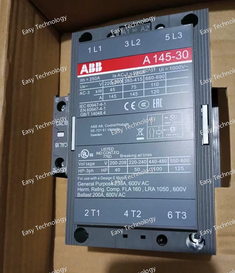 The ABB A145‑30‑11 is a 3‑phase, 3‑pole AC magnetic contactor from ABB’s “A‑line / A‑series.” It is designed to switch and control three‑phase motors or general power circuits in industrial, commercial, or HVAC environments. The contactor uses a standard AC coil, and includes both main power contacts and auxiliary contacts for control or signalling. Its robust design, wide operating voltage range, and ability to handle high currents make it suitable for motor starting/stopping, bypass/isolation, distribution circuits, and other heavy‑duty switching applications.
