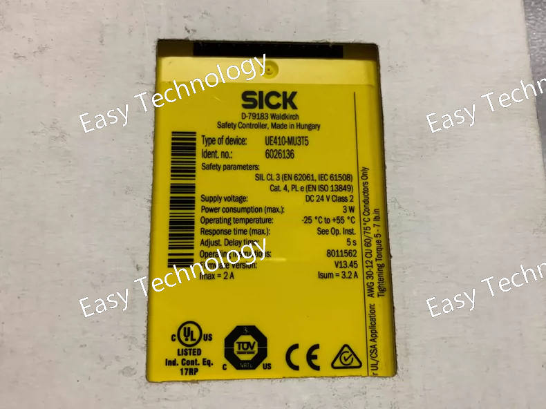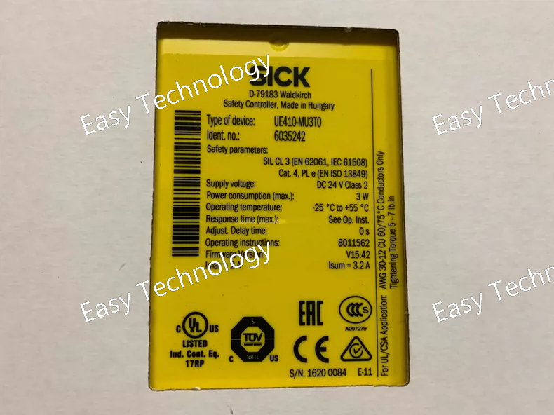 The SICK UE410-XU3T5 is a modular safety relay designed as a configurable safety monitor. It processes signals from safety devices (like E-Stops, light curtains, and interlock switches) and provides a safe, redundant output to control a machine's power contactor, ensuring compliance with safety standards (e.g., SIL 3, PL e).