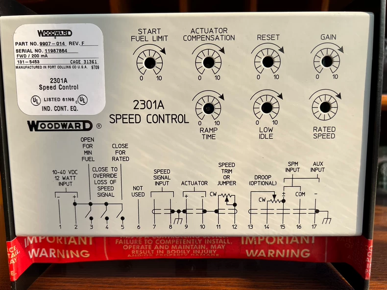 The Woodward 2001E-12V T32 is a 12V DC-powered digital governor controller designed for small/medium diesel engines in industrial and marine applications.
